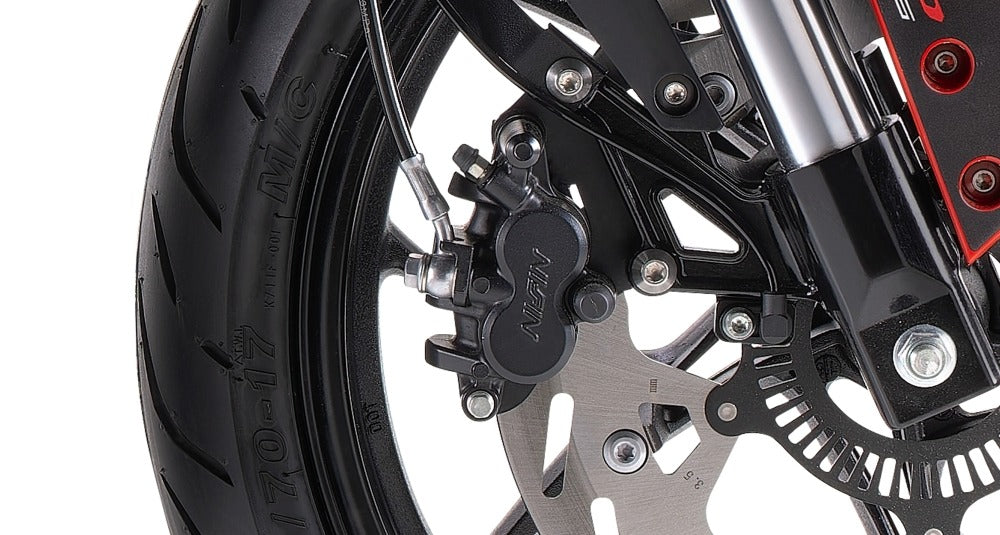 Sistema Nissin con pinza delantera de 4 pistones que asegura una frenada potente, dosificable y constante. Ofrece un control total en cada situación y un equilibrio perfecto entre seguridad y tacto deportivo.
